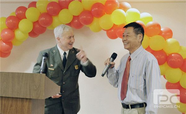 美国联邦绮丽湖火山国家公园园长艾克曼(左)做主旨发言,石武先生现场翻译