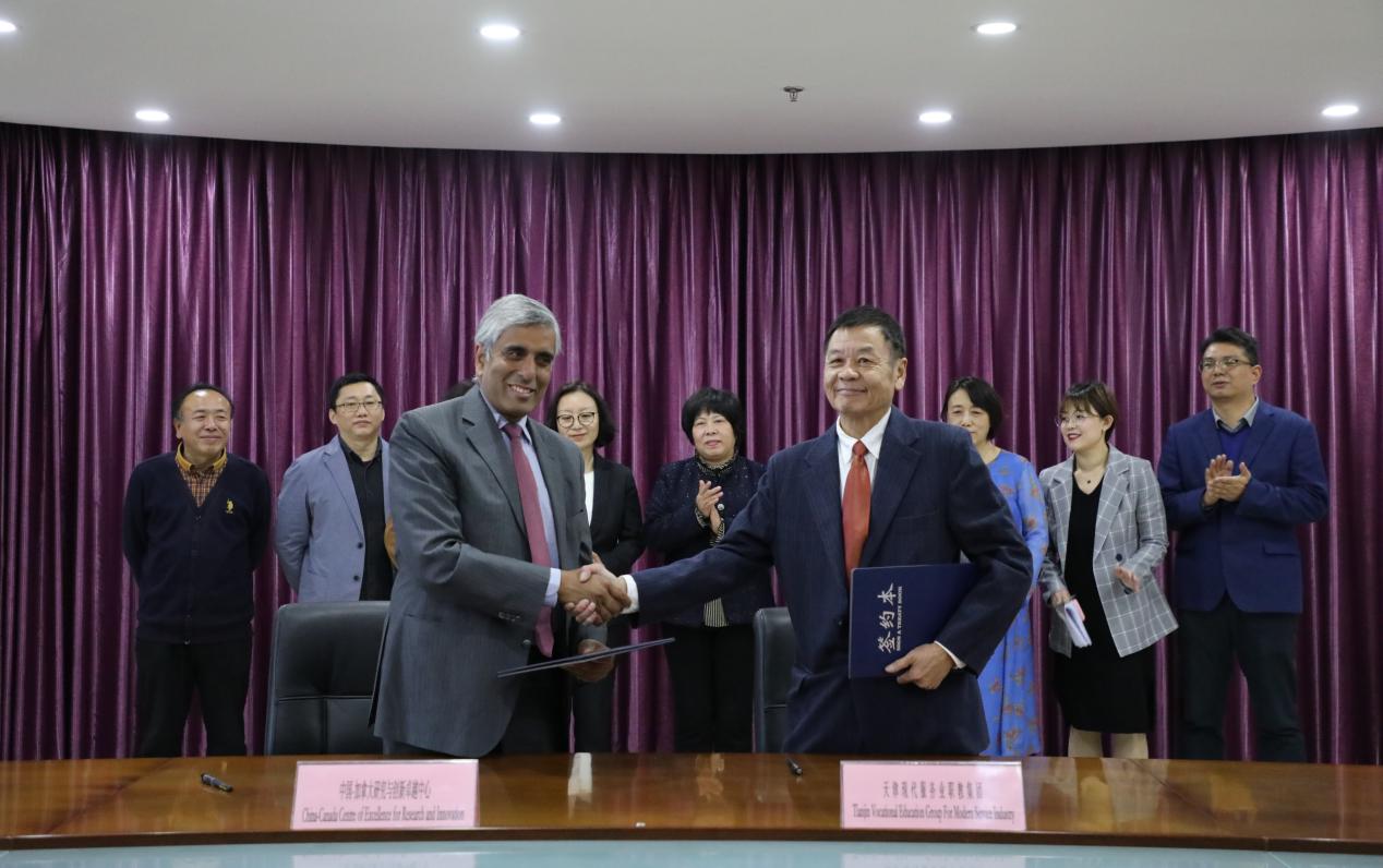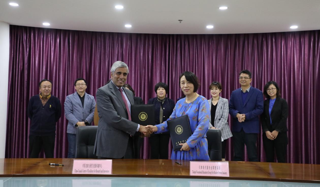 17日下午代表团来到天津职业大学,副校长杨荣敏主持了接待,外事处、合作办、经管学院领导,天津市现代服务业职教集团骨干企业代表参加了此次会谈。首先,杨荣敏副校长代表我校对顾教授一行的来访表示热烈的欢迎,并就我校的产教融合、校企合作、国际交流等领域的最新进展以及天津市现代服务业职教集团的基本情况做了介绍。顾教授对我校在产教融合方面取得的成绩表示钦佩与赞赏,并就与天津市现代服务业职教集团开展教学人员能力提升计划、共建“双创中心”项目表达了合作意愿,并希望在签订《谅解备忘录》的基础上,双方能够进一步开展更务实的合作。随后,天津市进出口商会秘书长石武介绍了参会的企业代表,并就校行企三方联动,搭建多元化育人平台,推行现代学徒制与参会各方交换了意见。接着,顾爱文代表中国-加拿大研究与创新卓越中心,与职大经管学院院长曹军教授代表天津市现代服务业职教集团共同签署了《谅解备忘录》。随后顾教授和代表团及参会的企业代表参观了我校的汽车实训中心、增材制造中心、机加工实训中心、校园快递公共服务中心、KFC校内实训基地、京东金融实训中心以及国际贸易服务中心,顾教授对我校的实训基地建设、职教集团外贸精英人才培养模式和外贸全产业链课程体系表示赞许。代表团一致表示可以将外贸全产业链课程体系带入加拿大的职业院校,从中国的实际了解中国的产业。参加交流活动的有:天津市进出口商会国际人才培养与交流专委会主任委员张强、微观(天津)科技发展有限公司总工杨志毅博士、振华东疆(天津)有限公司总经理李琳、天津金乐驰进出口有限公司美国分公司总经理刘晓晨、天津瑞肯新型材料科技有限公司总经理曲胜、顺和自然(天津)食品贸易有限公司总经理孙继国、天津市众诚博文教育科技有限公司总经理黄华、中云启迪(北京)科技有限公司董事长明天然博士、外事办副主任孟峥、 合作办副主任张玖泽、经管学院党总支书记张莉、经管学院副院长孙志东。
