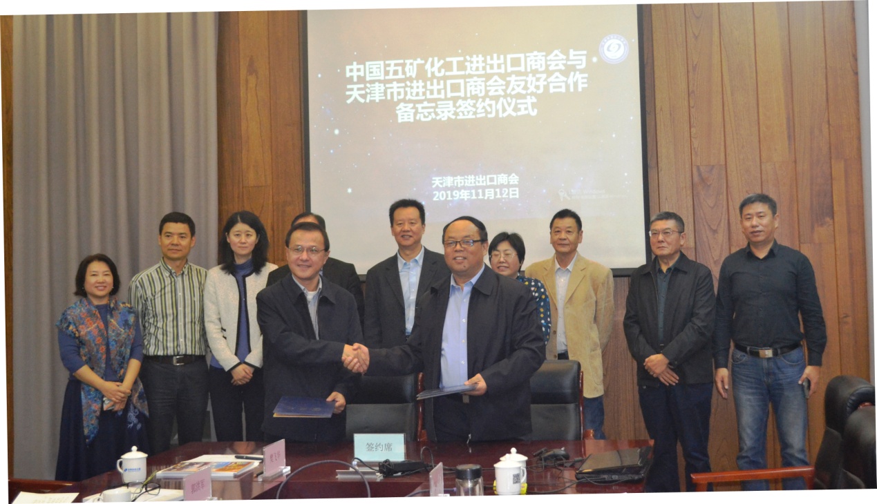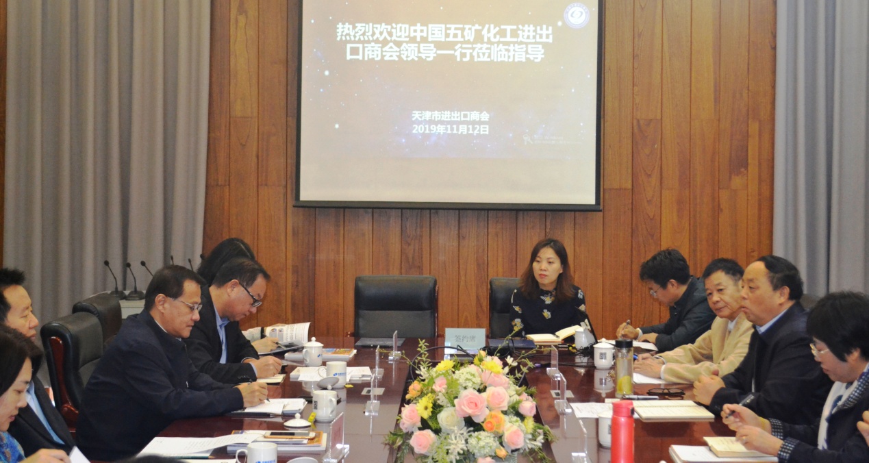 胜利同志首先对江会长一行来我会调研表示热烈欢迎,向客人全面介绍了天津市进出口商会的功能定位、工作规划和发展思路,同时表示,感谢五矿化工进出口商会对天津市进出口商会的支持和帮助。近期两会互动频繁、交往密切,合作势头良好,天津市进出口商会以与中国五矿化工进出口商会签署《友好合作备忘录》为契机,建立更加紧密的联络沟通机制;积极协助五矿商会协调天津口岸相关事务;两会要在在境内外各类展会、专题培训和高层级会议、论坛等领域开展合作。 江会长介绍了五矿商会转变协调管理职能、实施精准服务和完善服务体系的工作情况以及五矿商会 “一个机制、四个平台、八项服务”的组织架构和目标任务,同时希望两会在多方面开展密切合作,实现合作共赢、互利互惠。天津世纪五矿贸易有限公司冯美娟董事长和鲁彤总经理表示,将继续发挥好五矿商会兼职副会长和进出口商会常务理事单位的双重身份的重要作用,做好服务和引领工作,为行业和商会做出更大贡献。江会长对天津世纪五矿反映的企业在知识产权保护方面遭遇的问题,表示要高度关注此事,并向相关部门反映,积极维护企业 的合法权益。在两会代表的共同鉴证下,江辉会长和李胜利同志分别代表两会共同签署了《友好合作备忘录》。商会还协助安排并陪同五矿商会一行拜访了商务部驻天津特派员办事处和市商务局。