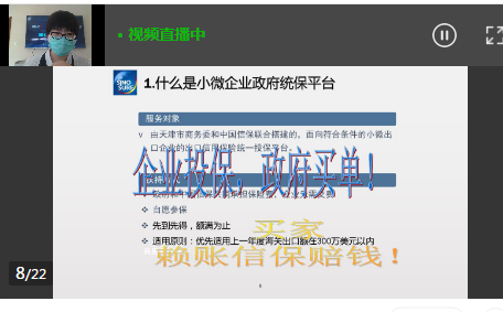 直播会上,中国出口信用保险天津分公司业务部负责人详细解读了“单一窗口”政策性出口保险的新政新规,并就目前疫情所引起的国别风险以及外贸风险识别和控制进行了提示;同时,详细讲解了中信保公司最新推出的两款创新服务类产品“资信红绿灯”和“小微学院”,上述APP产品可在手机端应用,“资信红绿灯”方便企业快速查询国外客户资信情况,“小微学院”普及出口保险政策知识和保险产品的知识类互动平台。中国建设银行天津分行国际业务部负责人详细介绍了建行依托“单一窗口”融资平台,为帮助外贸企业抗击疫情而特别推出的全线上、低利率的信保贷、出口贷和退税贷三个金融产品;建行讲师还重点推介了建行特有的国际国内贸易在线撮合平台,该平台在疫情期间对促进国内外贸易线上供需对接方面,平台将进行进一步优化和改版。参与企业还就所关心的问题进行了在线交流。