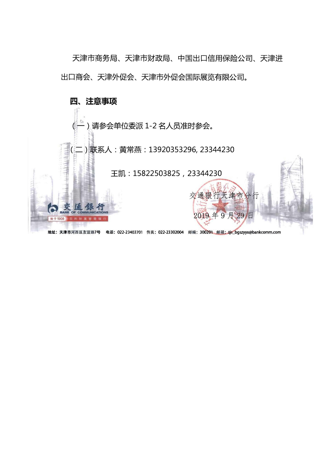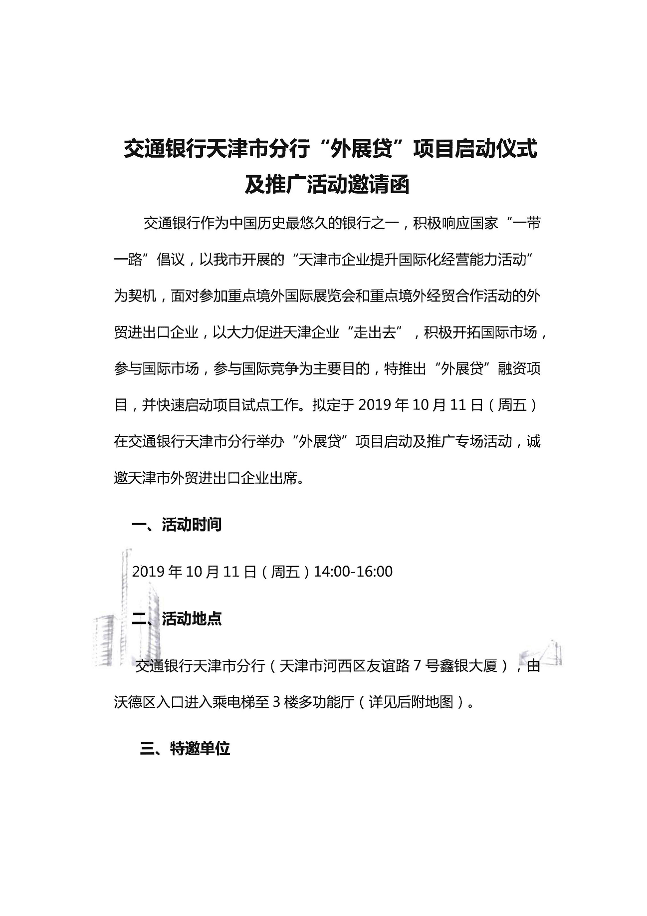 交通银行天津市分行“外展贷”项目启动仪式及推广活动邀请函